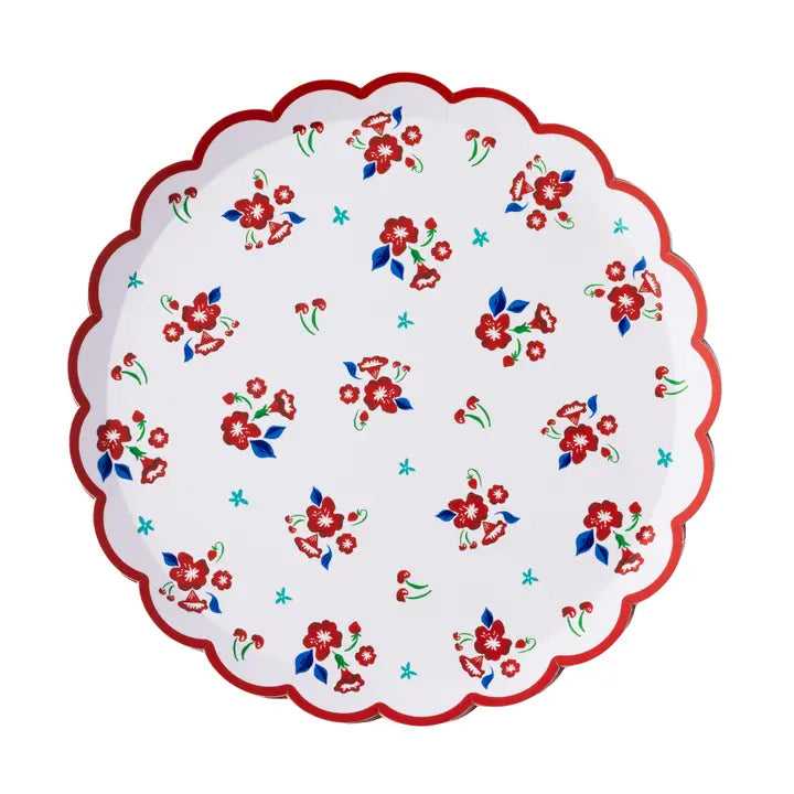 Betty Crocker™ x Bonjour Fête Vintage Floral dessert plates featuring red and blue florals with a bold red scalloped trim. Perfect for birthdays and celebrations, with coordinating large napkins available for a charming, cohesive tablescape. > Includes 8 paper plates > Size: 8.5"D (Small/Cake size) > Shape: Round