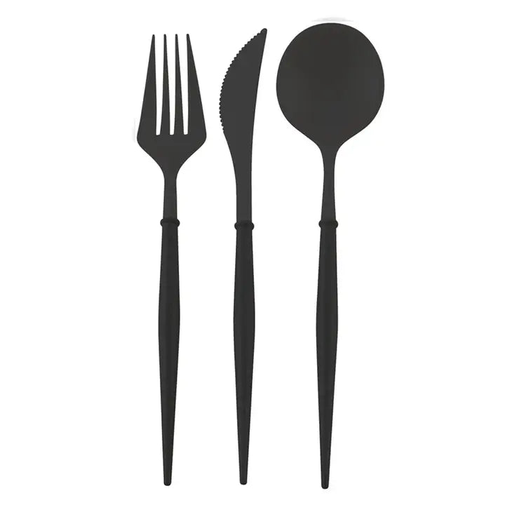 The Bella line of disposable plastic cutlery by Sophistiplate is a gorgeous and sleek modern design that elevates any table, place setting, or event. Perfect for Birthday Parties, Date Night, Family Gatherings, Holidays, Parties, BBQ's, Outdoor Entertaining, Kids Parties, and more. Quantity: Pack contains 24 pieces including 8 forks, 8 knives, 8 spoons. Material: Food-safe, heavyweight ABS plastic that's BPA Free!