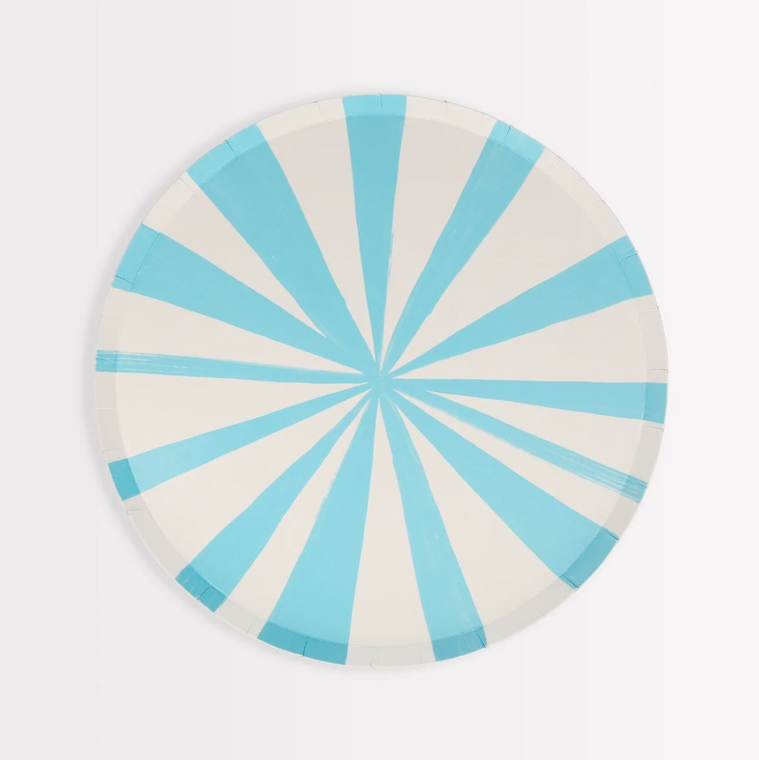 These wonderful blue striped side plates are the perfect color for a boy's birthday party or baby shower. They are crafted from high quality paper, so are practical as well as decorative.