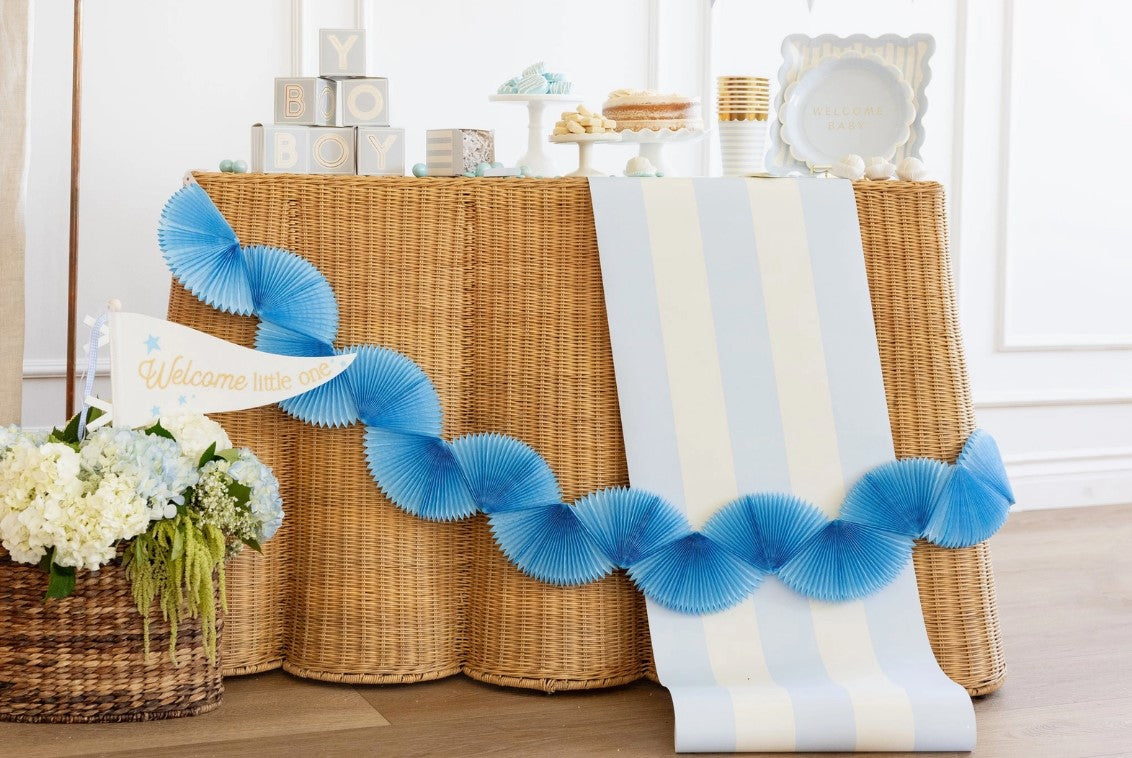 Set a cheerful and stylish scene for your baby shower with the Blue Striped Table Runner. Its crisp blue cabana stripes bring a fresh, nautical vibe that's perfect for celebrating in style. Designed to coordinate effortlessly with your decorations, this runner adds a festive touch while protecting your table.