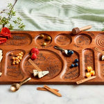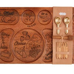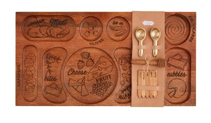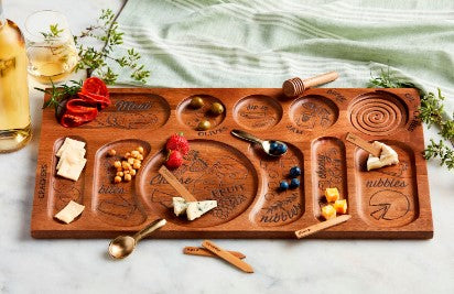 9-piece set. Engraved mango wood charcuterie board with hallowed out service wells comes with two brass finished spoons, wooden honey dipper and five wooden cheese markers.