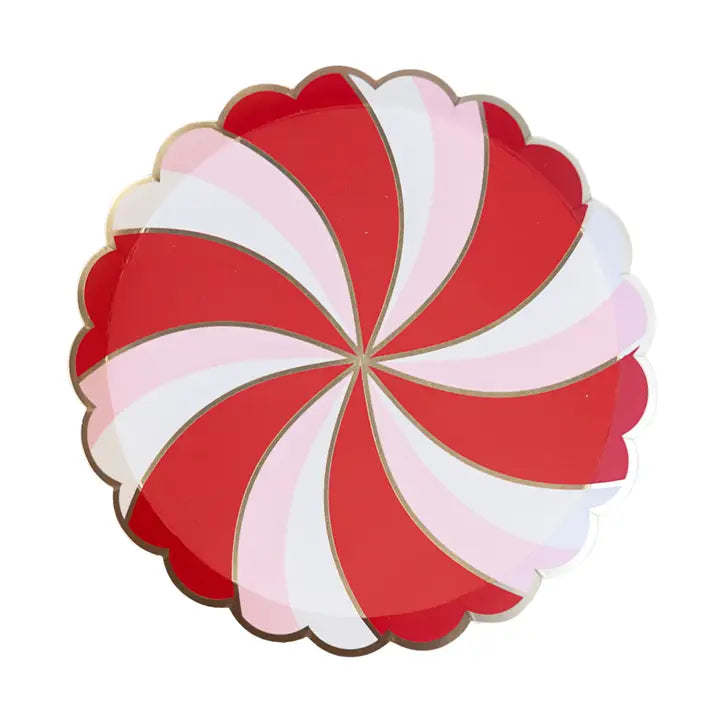 Christmas Peppermint Candy Small Scalloped Plates! These are must-have pink, red and gold foil cake plates! > Includes 8 paper plates > Size: 8.5" diameter > Not microwave-safe