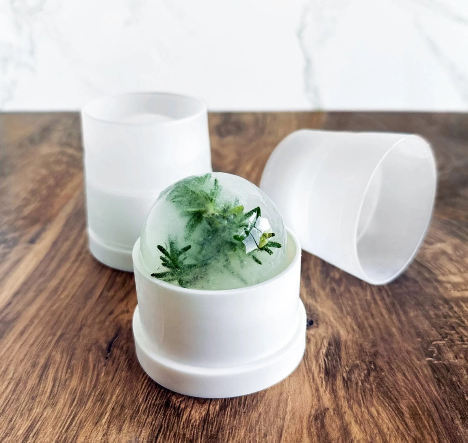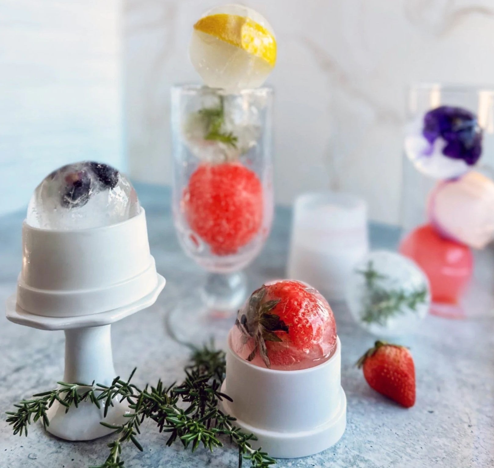Set of two ice sphere molds yield 60mm ice spheres. Freeze water to make fancy ice spheres that elevate a standard cocktail to a fantastic one. One big ball o' ice offers less surface area than standard ice and melts more slowly, which doesn't water drinks down as quickly. You can also freeze juice (orange juice for your mimosa, ma'am?) or add extras like herbs, edible flowers, lime wedges, or other yummies. Get creative! Elevated packaging is lovely for gifting.