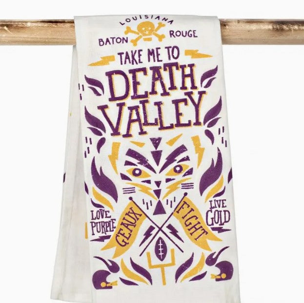 A white tea towel with artwork of Death Valley in Baton Rouge, LA with purple and gold colors. Towel design says “Take Me To Death Valley”, “Love Purple, Live Gold” and “Geaux Fight”.