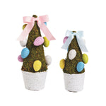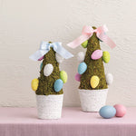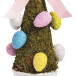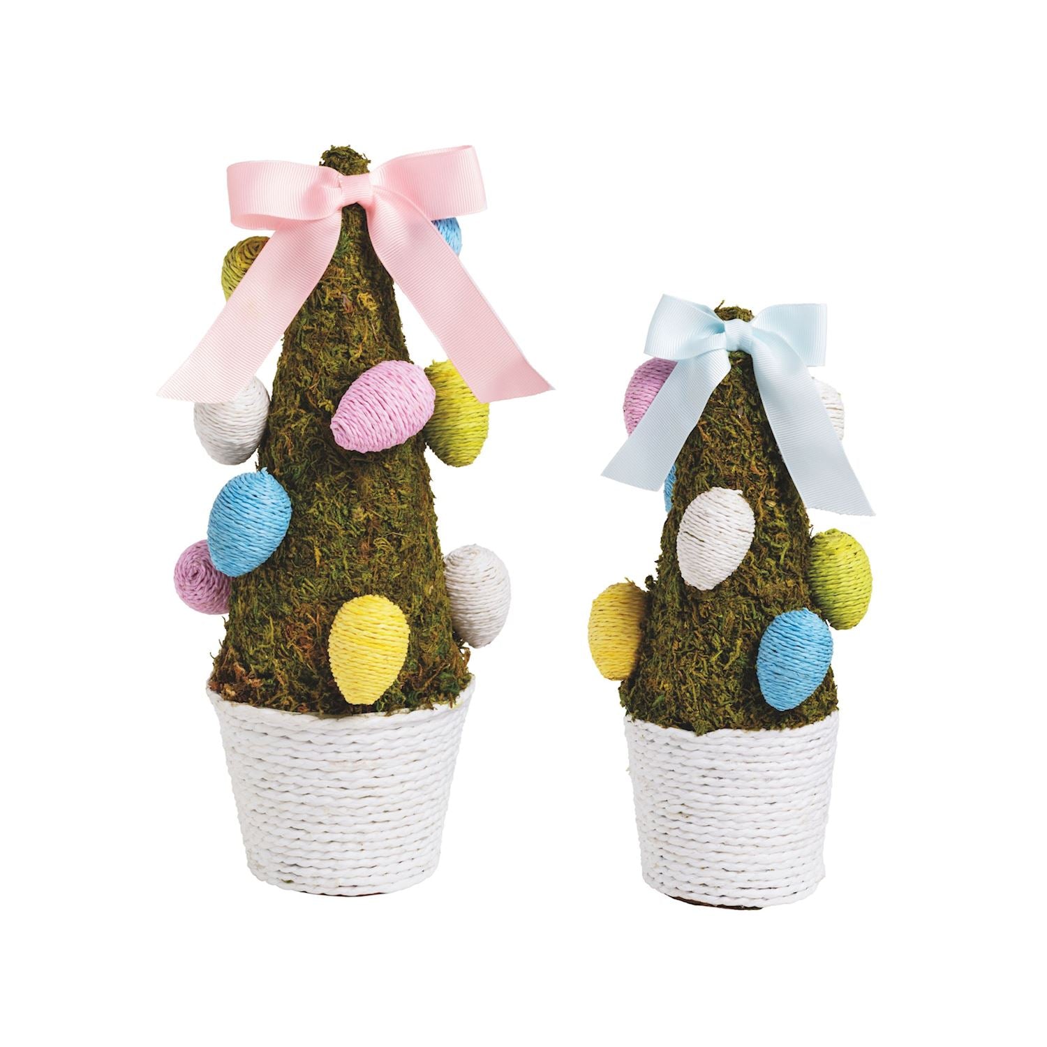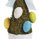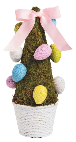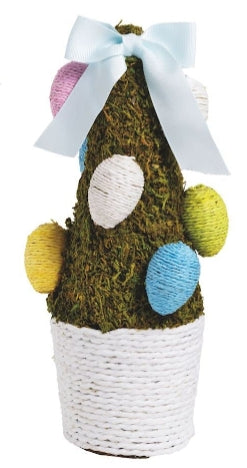 Moss topiary tree with cotton rope Easter eggs in paper rope basket.