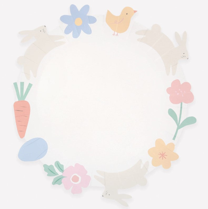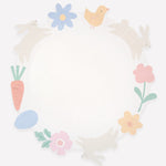 Elevate your Easter dinner table with these premium paper plates. Each dinner plate is edged with charming illustrations of bunnies, carrots, flowers, a chick and an egg, bringing a playful, decorative touch to your celebration. These deep sided plates are perfect for adding a little springtime joy and style to your table layering. Guaranteed to delight guests of all ages.