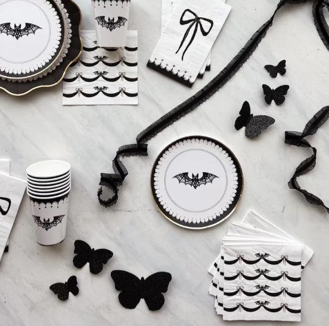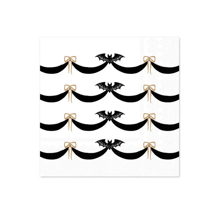 Elegant Halloween Dinner Napkins by Bonjour Fete. These napkins feature a lacy bat pattern and gold accents that add a touch of sophistication to any Halloween party. Designed for both kids and adults, these napkins are sure to impress with their refined yet spooky design.