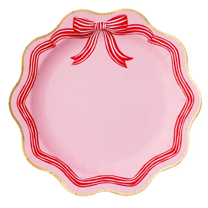 Add sophistication to your holiday table with our Elegant Pink Peppermint Bow Dinner Plates! Featuring a charming red bow and whimsical scalloped edges, these plates enhance any place setting while mimicking the elegance of chic china. > Includes 8 paper party plates > Size: 11" diameter