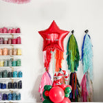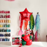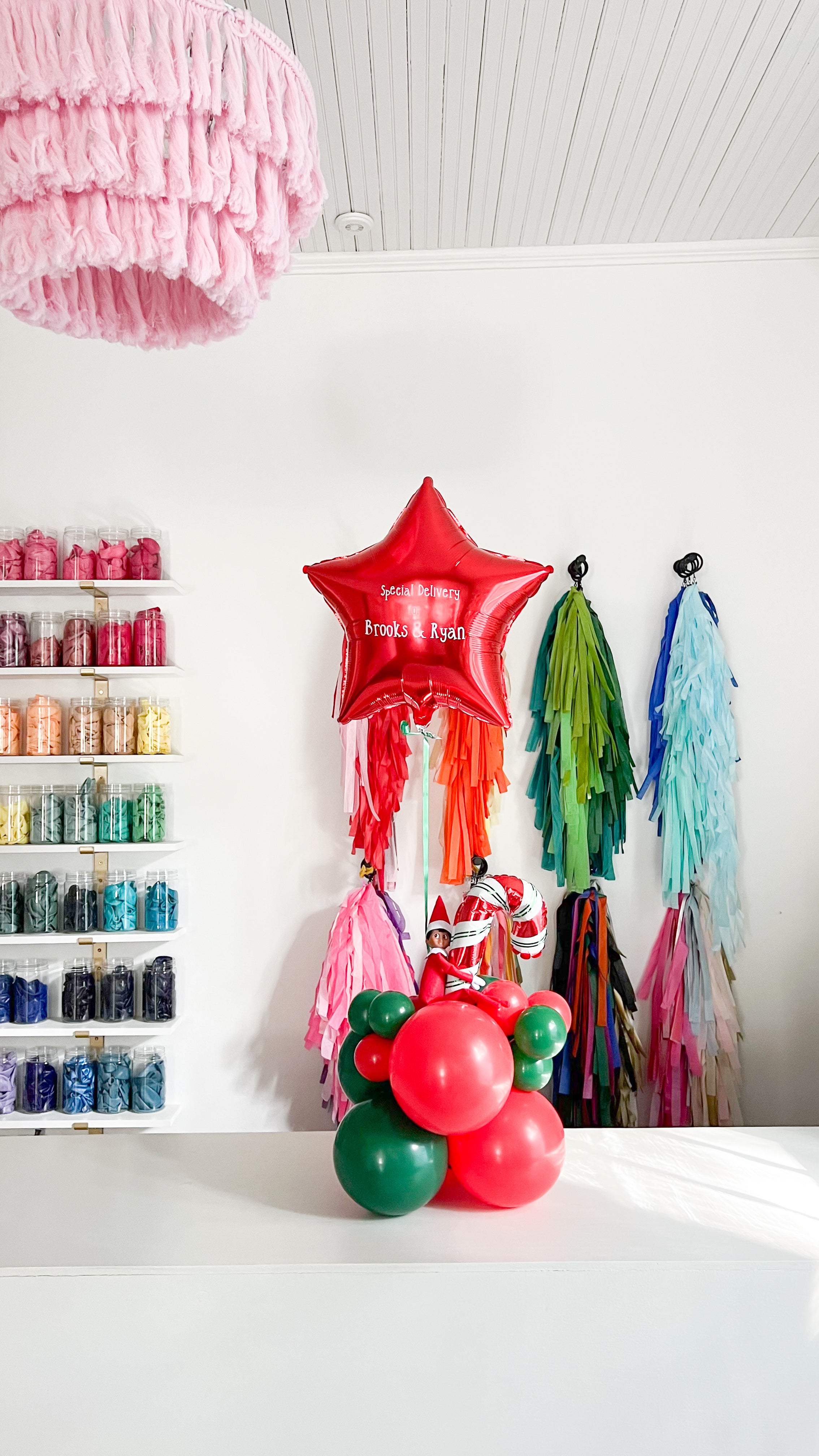 - A helium-filled 18" star with a vinyl message attached to a small latex balloon cluster with a mini candy cane foil balloon. Your Elf can easily slip his or her arms around the candy cane, or just sit on top of the cluster for an easy arrival!