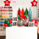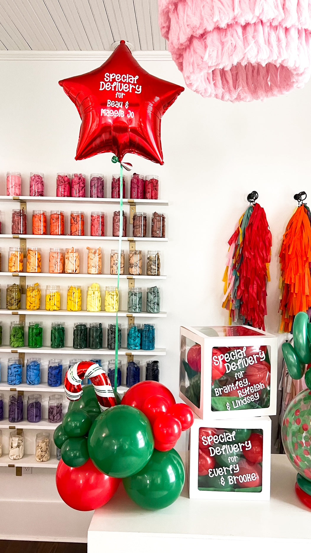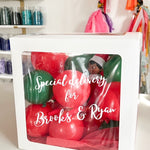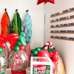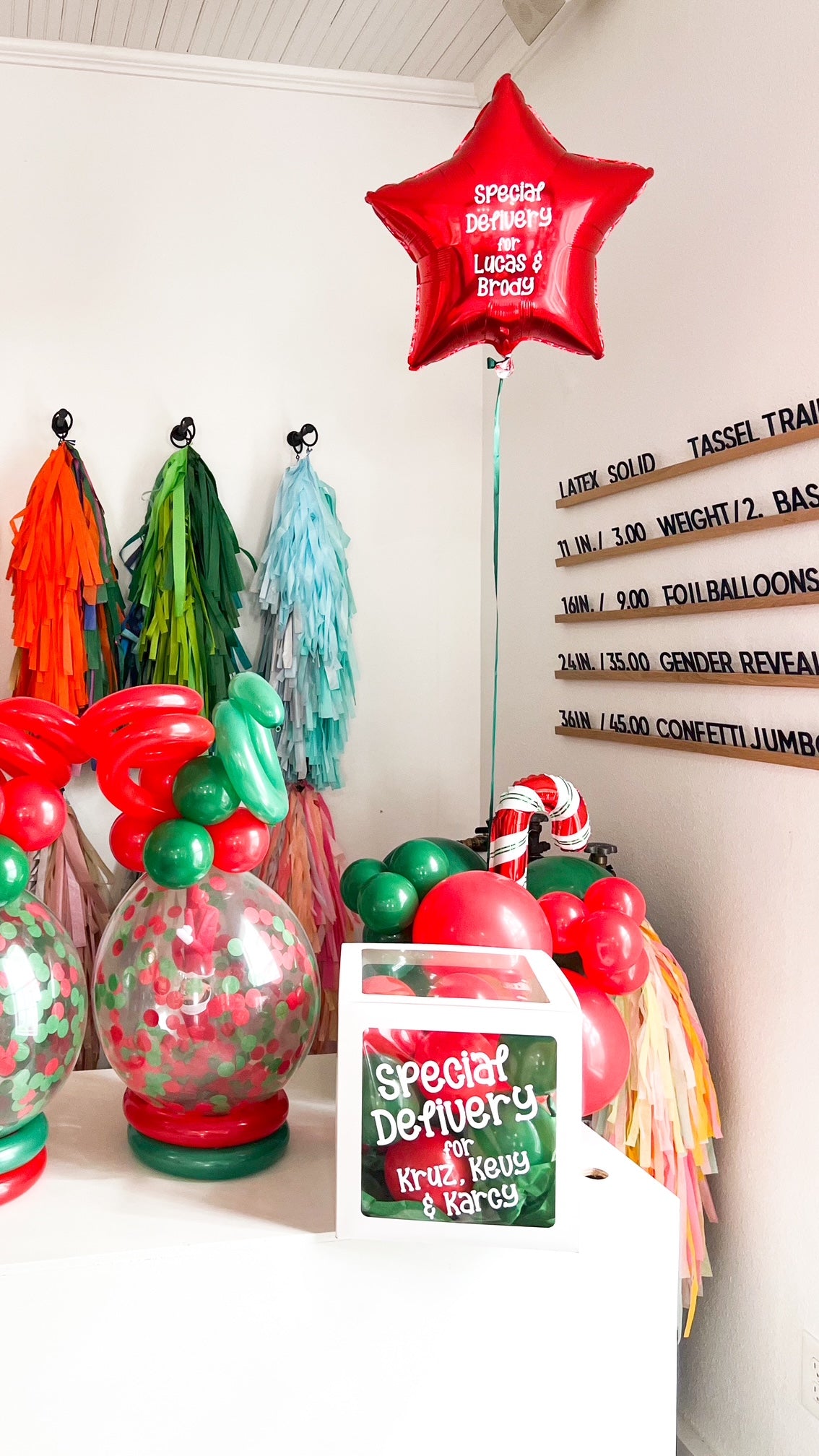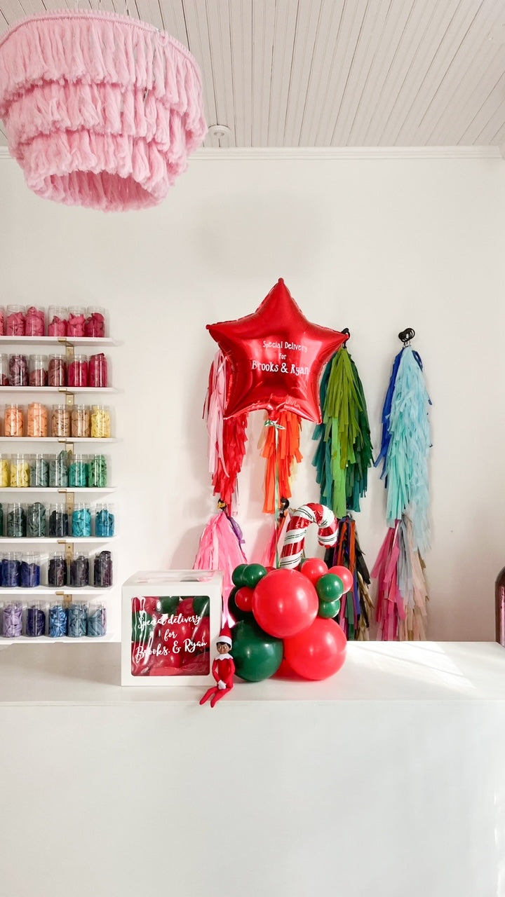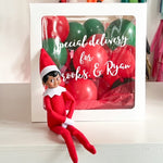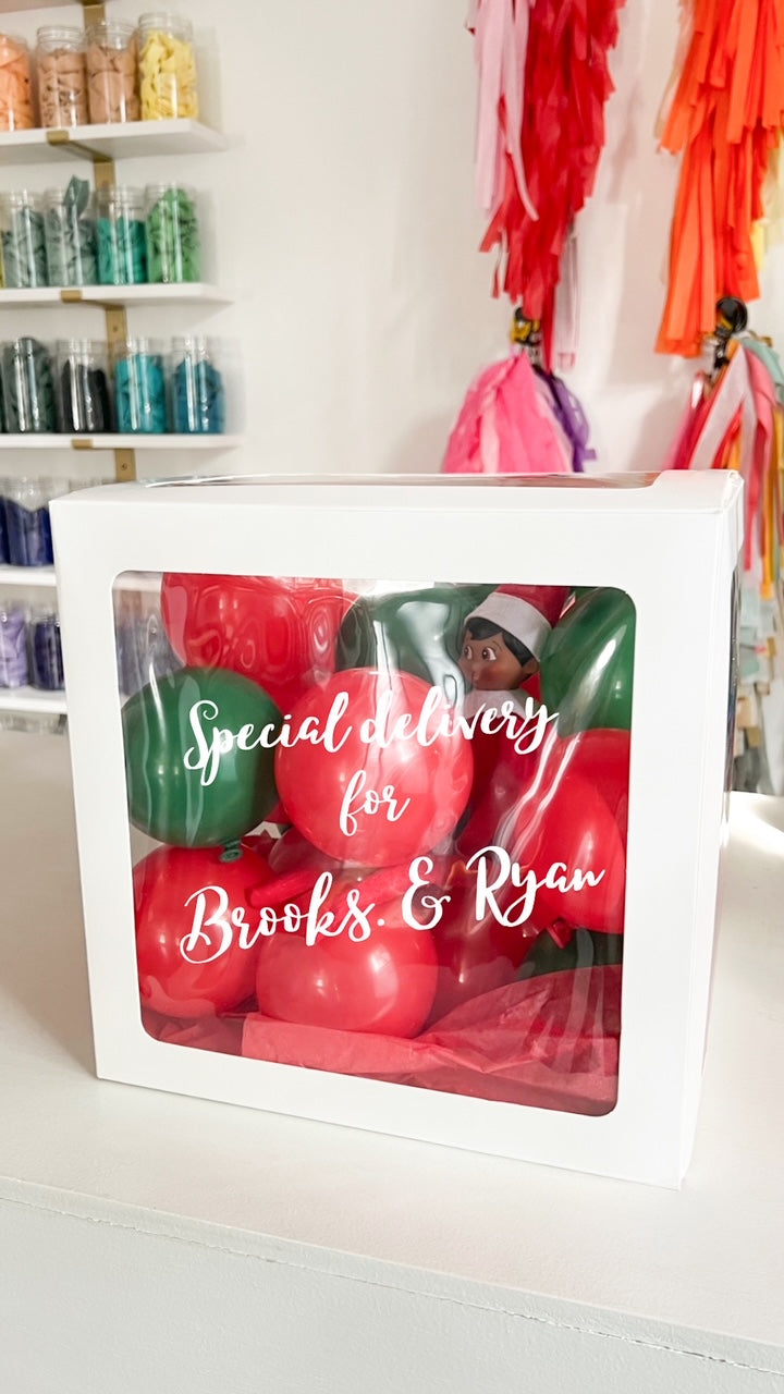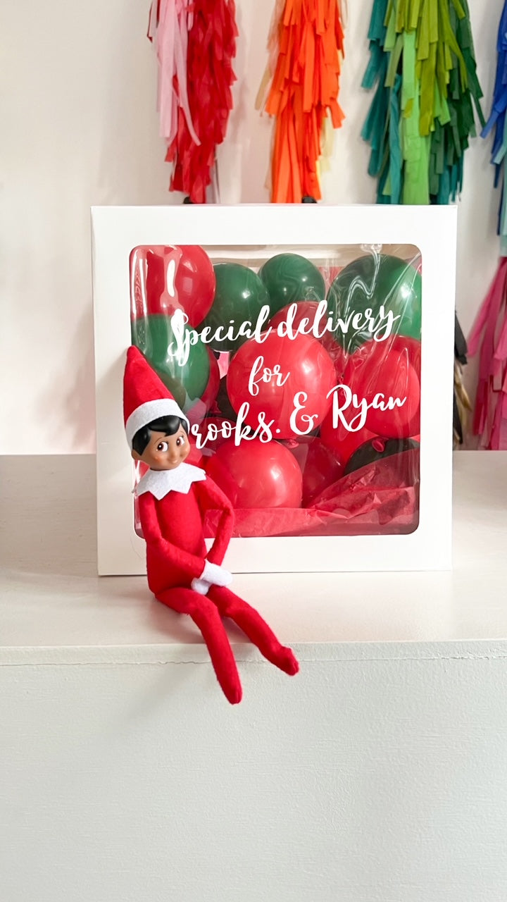 - Several of 5" red and green balloons in a white box, where you can easily stick your Elf inside for a fun arrival surprise! Includes vinyl message on the side of the box.