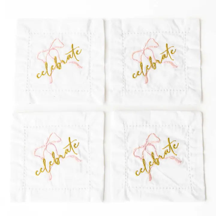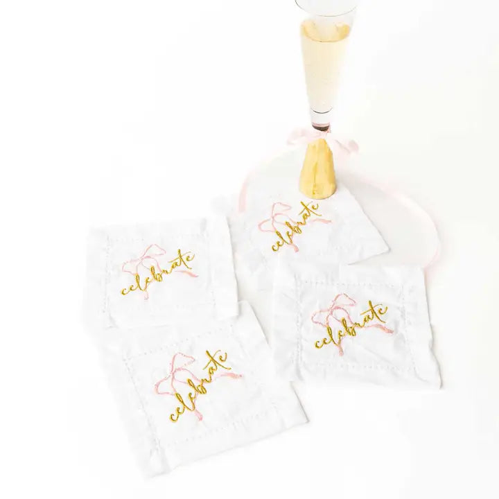 Enhance any gathering with the Pink Bow Embroidered Cocktail Napkin Set. These chic napkins infuse fun into ordinary dinner parties in a stylish and fashionable way. The crisp white 100% cotton material creates the perfect backdrop for the bold embroidery on each one. With pink bows stitched on each one, these napkins are sure to start a conversation at every event. They're extra convenient since they're boxed & ready for easy gifting. Feel like a true hostess with this unique set of four charismatic cocktail napkins designed in the USA & imported for your special nights! Amazing gifts for birthdays, graduation, housewarming, Christmas, Mother's Day, Valentine's Day, & many more special occasions!