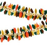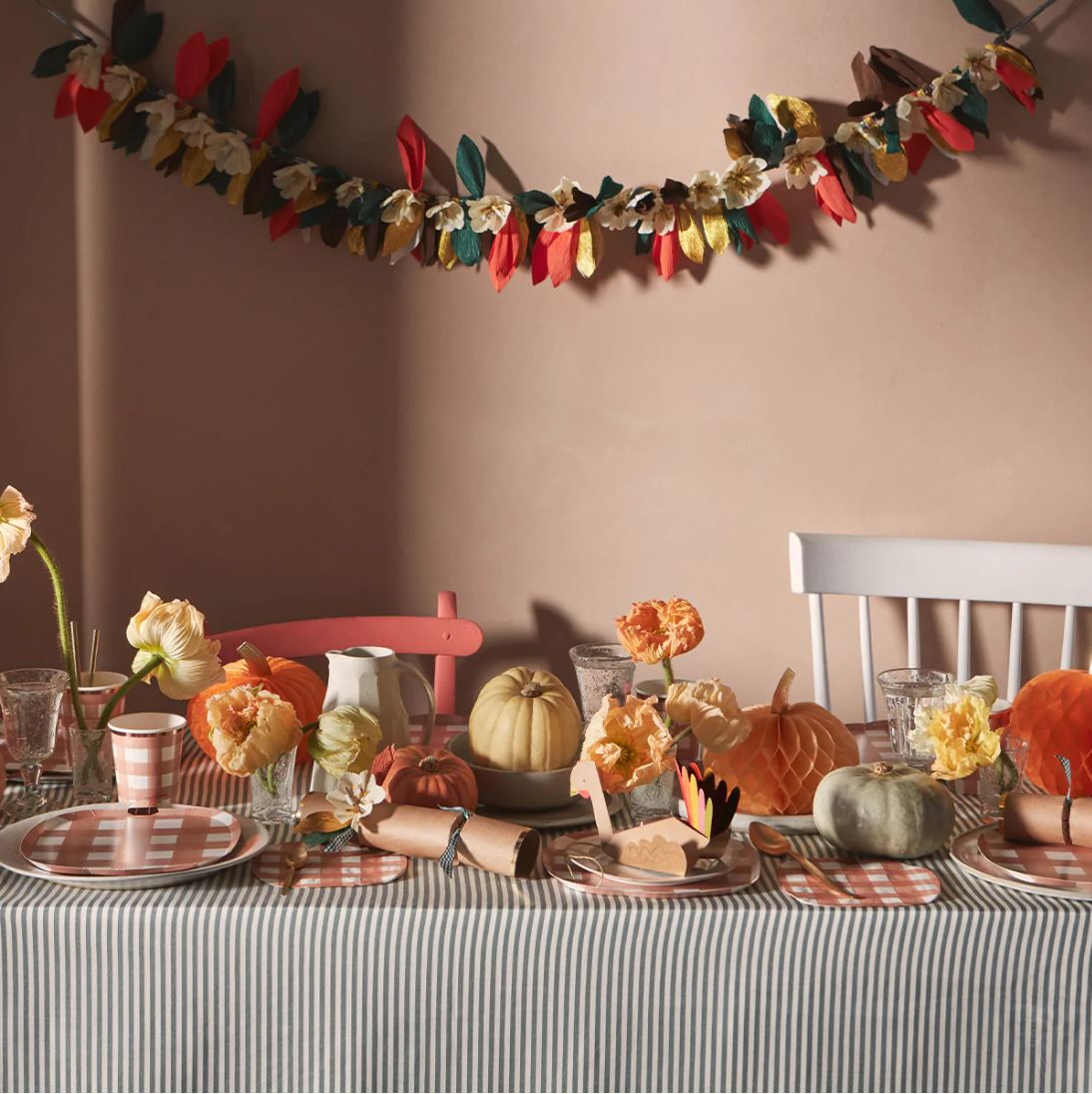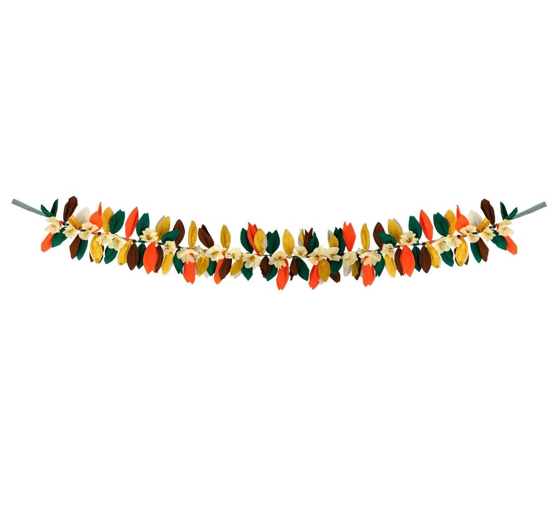 The amazing colors of fall are captured in this beautifully designed and crafted garland. The floral and leaf crepe paper decorations, attached to a gingham ribbon, will look wonderful at Thanksgiving, or any special celebration.