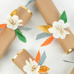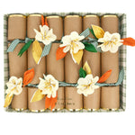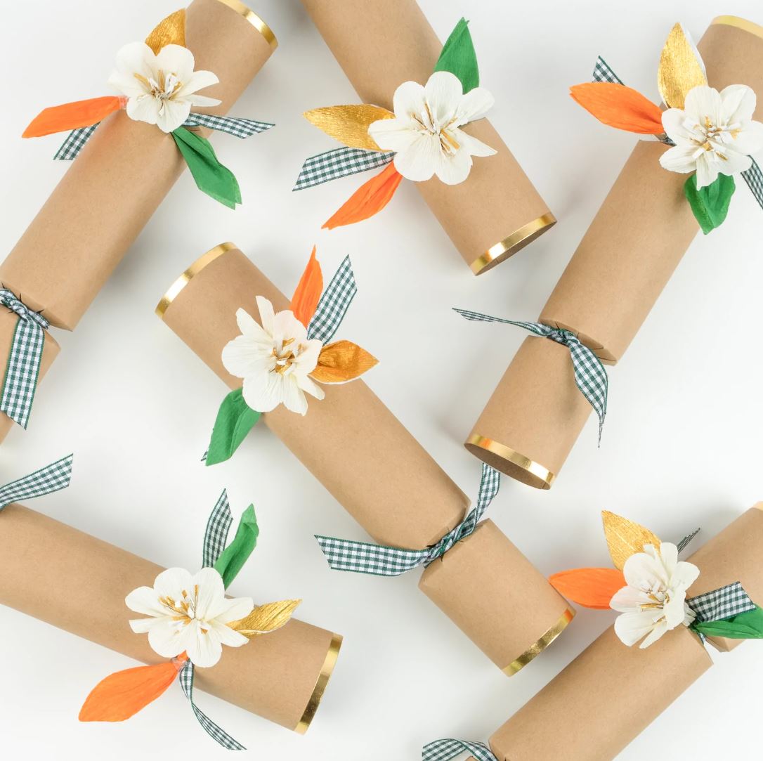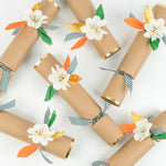 Add a touch of beauty to your Thanksgiving or fall party table with these luxury crackers. They are embellished with handmade crepe paper flowers and leaves, have gold foil borders and gorgeous green gingham ribbon ties. The contents are equally sensational, with a hat, joke and high quality gifts.