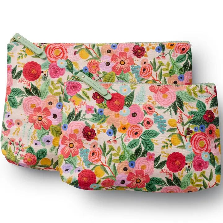 A set of two cotton canvas pouches featuring our signature Garden Party floral. The pouches are spacious and lightweight, great for travel, organization, or tossing in your everyday bag.