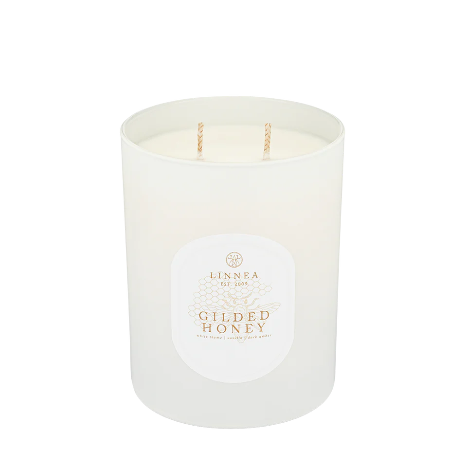 New limited edition, Gilded Honey captures the warmth of the season’s last golden light. White thyme weaves through velvety vanilla and rich dark amber, evoking the final harvest of honey and wild florals nestled in vibrant fall foliage. Housed in our signature alabaster glass with a double wick for an even, radiant burn.