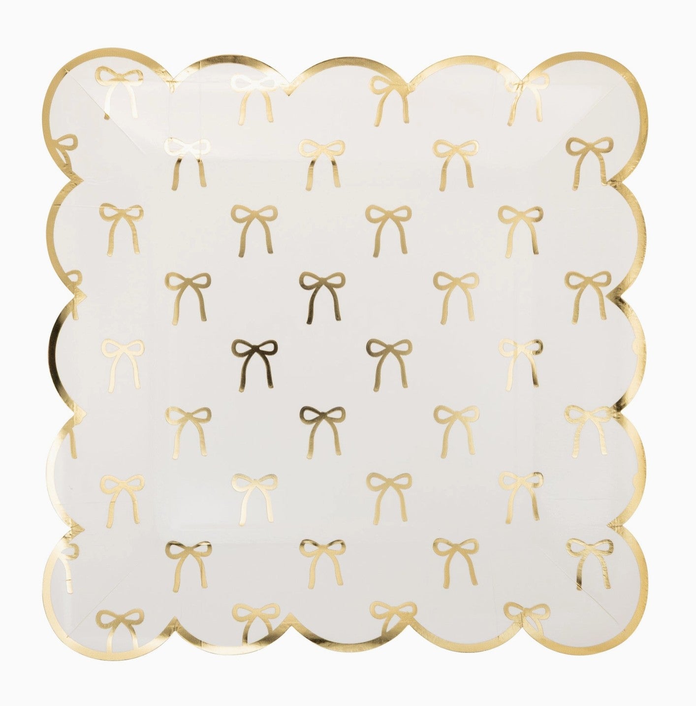 Add a touch of festive elegance to your table with these Gold Bows Paper Plates. Featuring an elegant gold bow design, they perfectly complement your table setup while making cleanup effortless.