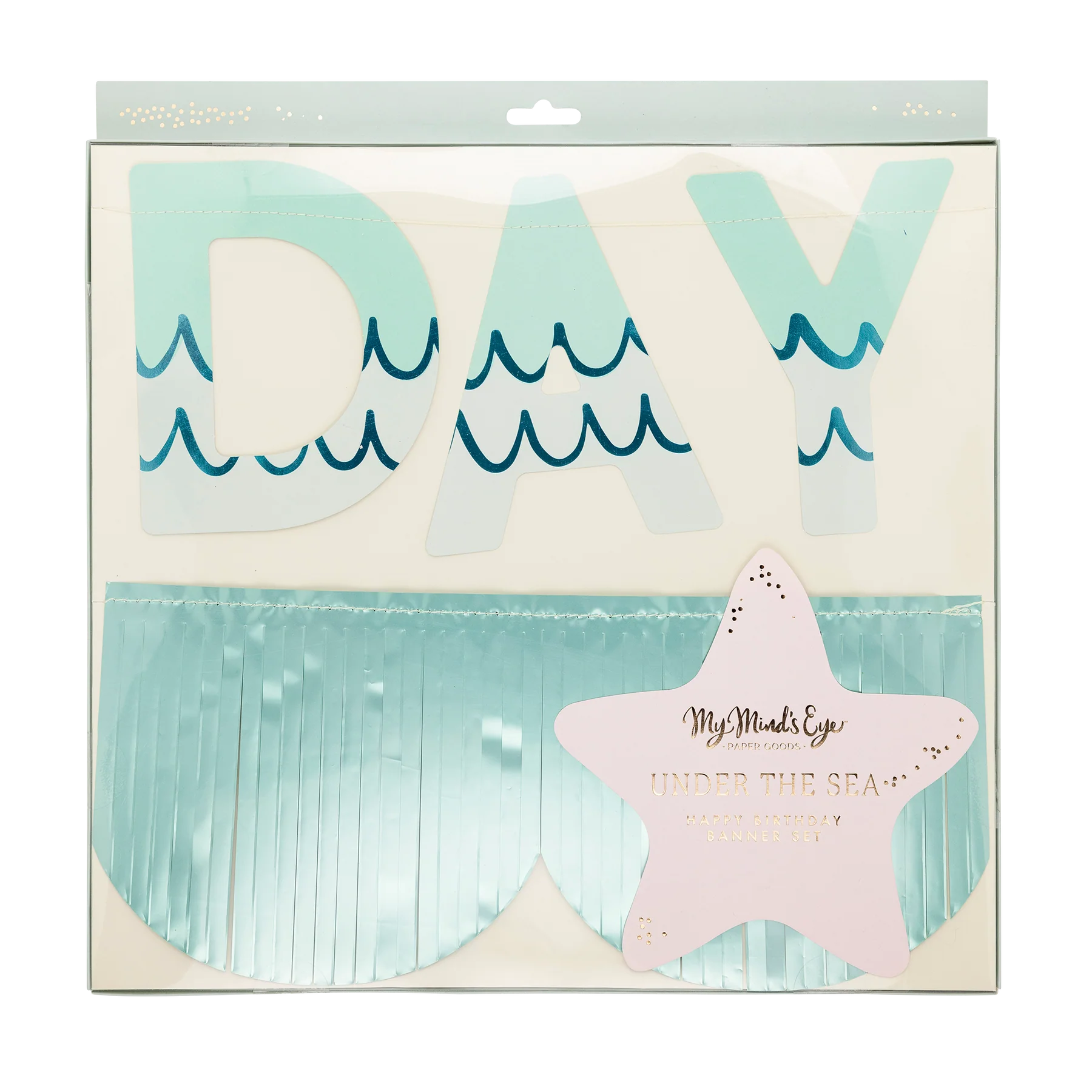 Add an ocean-inspired touch to your next birthday celebration with our Happy Birthday Banner Set! This under the sea banner set features a festive "Happy Birthday" message and includes a fun mylar fringe banner. Get ready to party in style with this unique and playful banner set!