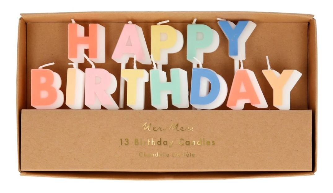 A simple way to turn a cake into a birthday delight is with these mini candles. They spell out the words "Happy Birthday" in a colorful way.