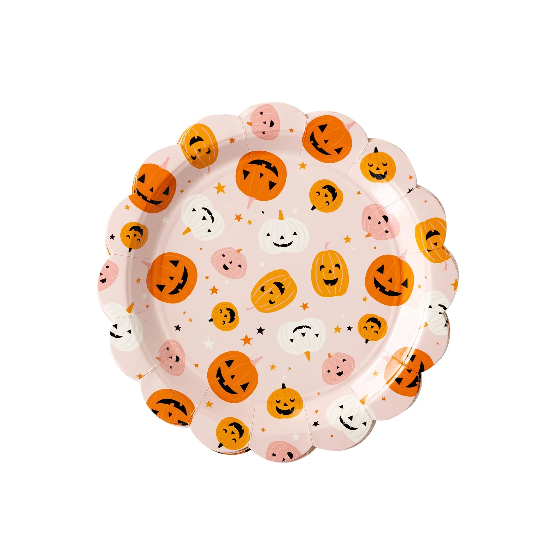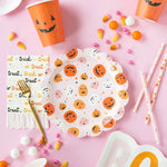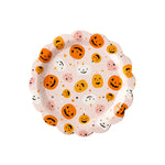 Friendly frights abound with these pumpkin dinner plates. Featuring a colorful and whimsical jack o' lantern pattern these scalloped edged paper plates set the perfectly spooky scene at your next Halloween party.