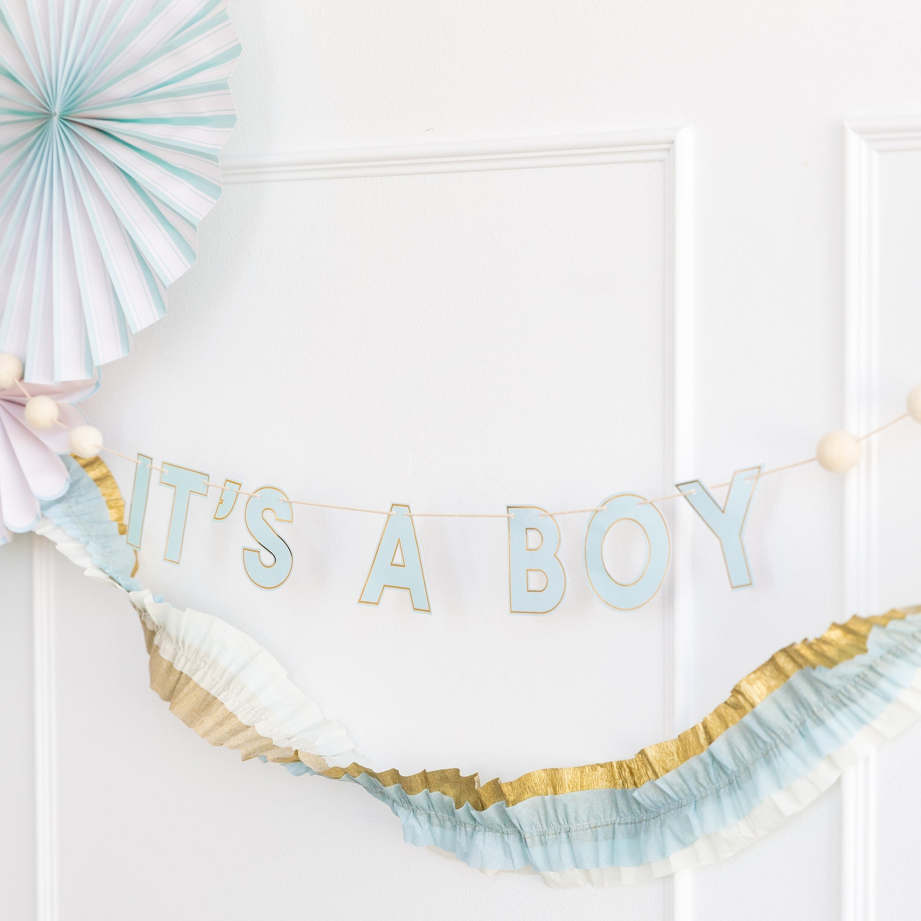 Oh baby! It's a boy, and it is time to celebrate. Grab this word banner as the perfect accent at your baby shower. This 2 foot banner will add the final touch to the treat table at your party. Or hang it with the matching blue baby fans to complete a sweet and elegant background for your soiree. Decorate baby boy's nursery with this IT'S A BOY banner and our new cream/blue/gold crepe festoon to welcome home baby.