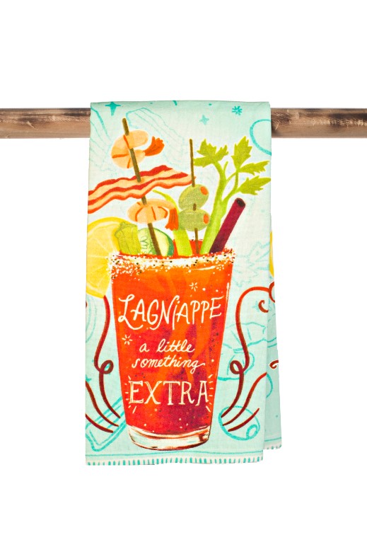 A colorful tea towel featuring out Lagniappe design. The artwork features a Bloody Mary cocktail with the words “Lagniappe A Little Something Extra” on the glass with a blue background.