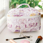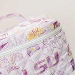 OFFICIALLY LICENSED BY LSU This 10x7x6 inch quilted make up bag is perfect for LSU fans everywhere! The large toiletry bag features a handle on top and an inside pocket. The bag is light purple with watercolor illustrations of LSU icons, such as Death Valley stadium, Geaux Tigers, a fleur, a yellow and purple shaker, a football helmet, and more!