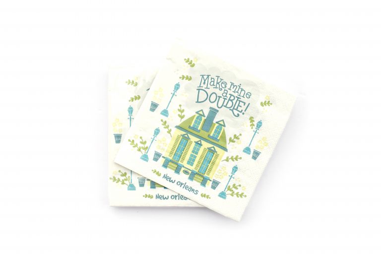Small dinner napkins featuring artwork of a double shotgun creole cottage house with the saying “Make Mine a Double!”. Also displays the words “New Orleans”. Napkins have green, blue and yellow colors.