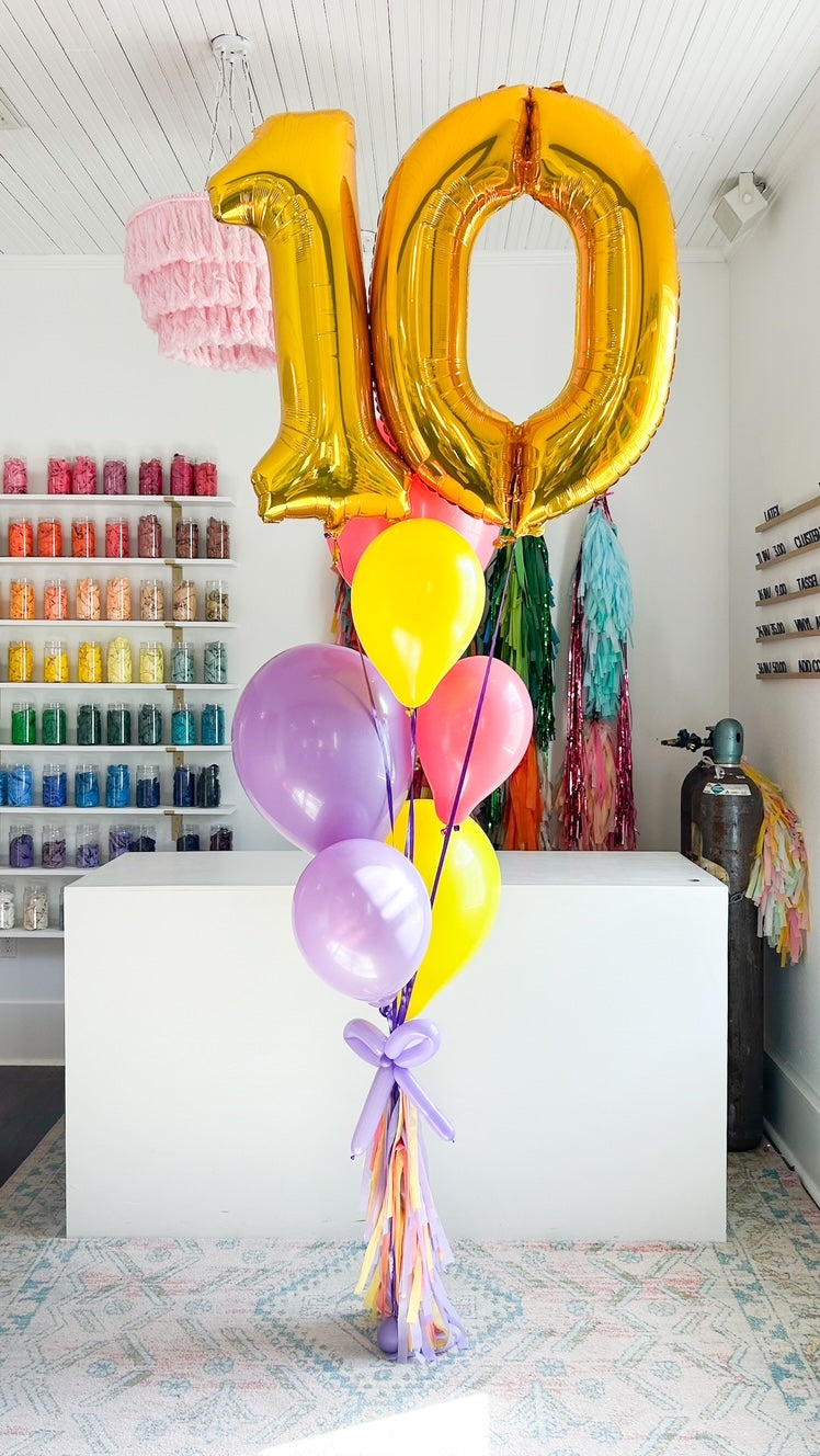 - You can choose to add on an additional number to make it a double number bouquet or add on a themed/character foil balloon shape.