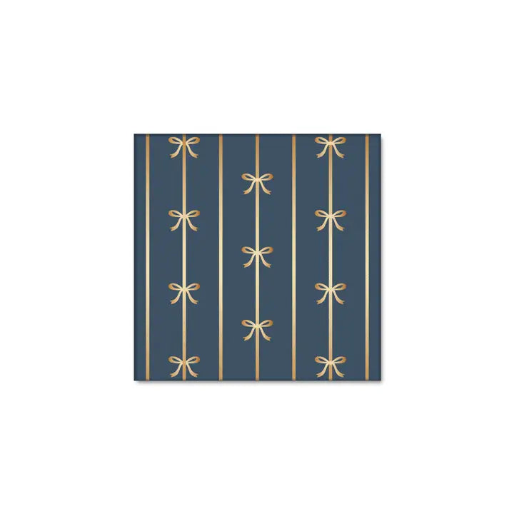 Midnight Blue Signature Bow Small Napkins from the Bonjour Fête Signature Line. These cocktail napkins are adorned with gold foil dainty bows and beautiful simple gold stripes.