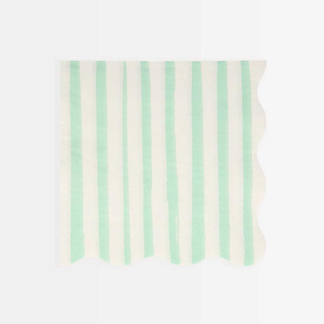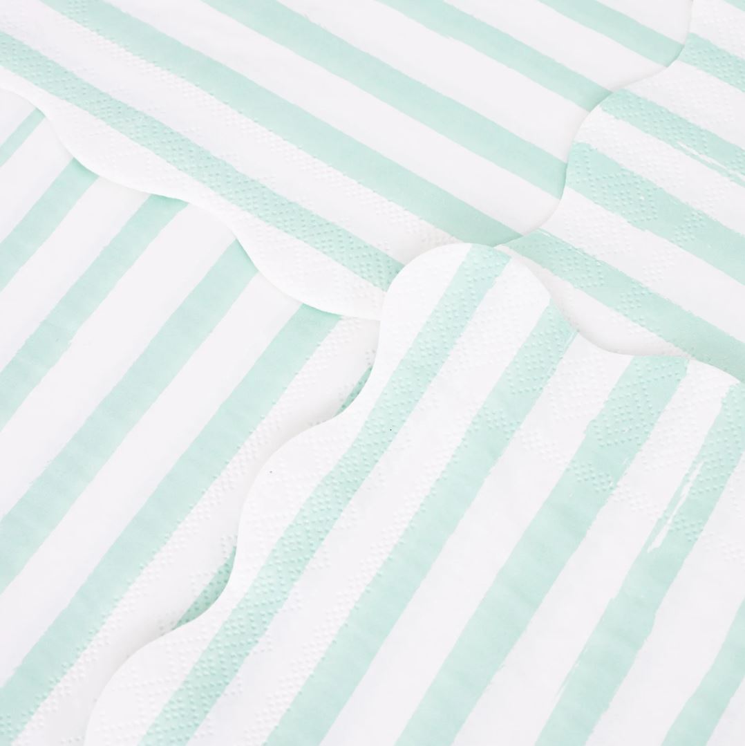 These mint and white striped napkins will complement any party color theme. The scalloped border adds a really stylish effect too.