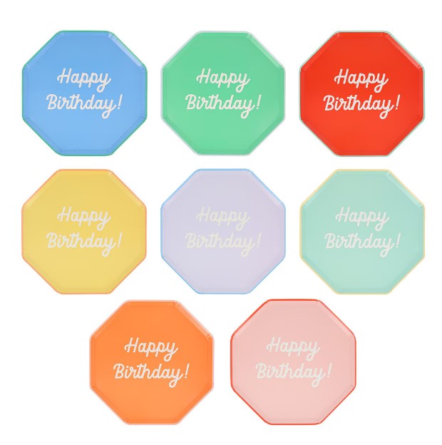 You can never say “Happy Birthday” too many times, so let these special paper dinner plates spell it out for you! This set contains a rainbow of colors to brighten up any birthday party and beautifully complement the rest of your birthday party supplies. Each octagonal plate also has a coordinating colored border to add extra style to the celebrations.