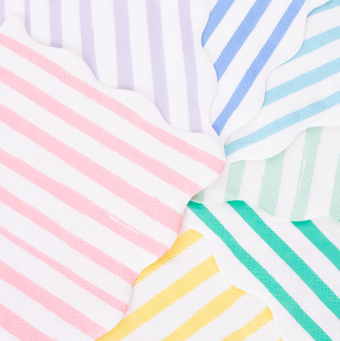 Stripes are a sensational way to add lots of color and style to any party table. These wonderful large napkins feature 8 different stripes of color, and scalloped edges, for a decorative effect.