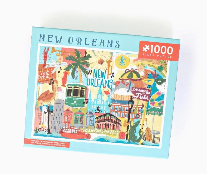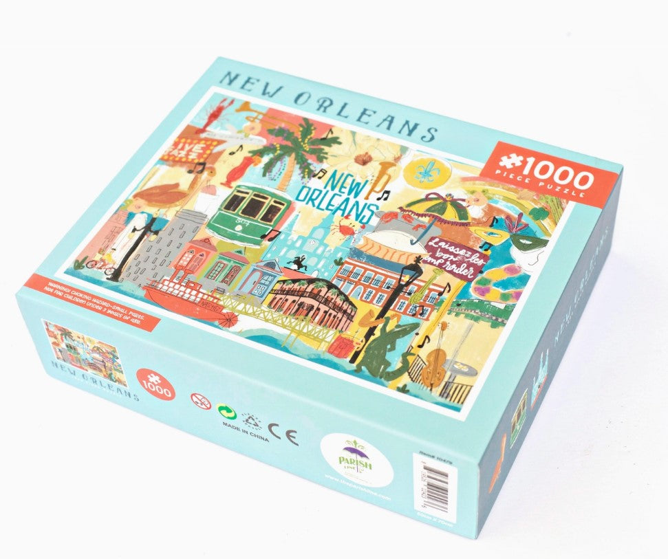 A 1000 piece puzzle that includes all of the staples of New Orleans life including street cars, creole cottages, Mardi Gras masks and more. Dimensions: 20"w X 27h