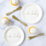 Are you planning a soiree to welcome baby? These 7" round paper plates have got you covered. Don't worry these cute cream and gold party plates won't reveal the surprise too soon.