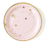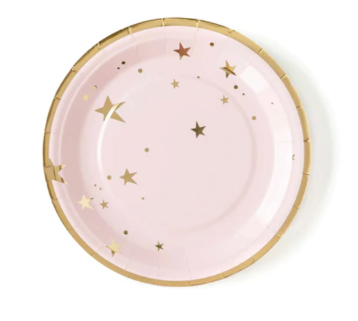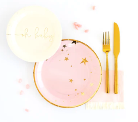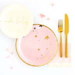 Simple, sweet, and stylish are the perfect way to describe these 9" party plates. With a timeless gold foil star pattern, these paper plates will set the perfect table for your next girly celebration. If you're hosting a classic and chic baby girl shower make sure to include our Oh Baby 7" party plate and 5" Baby Pink Fringe Cocktail napkins to finish a timeless tablescape!