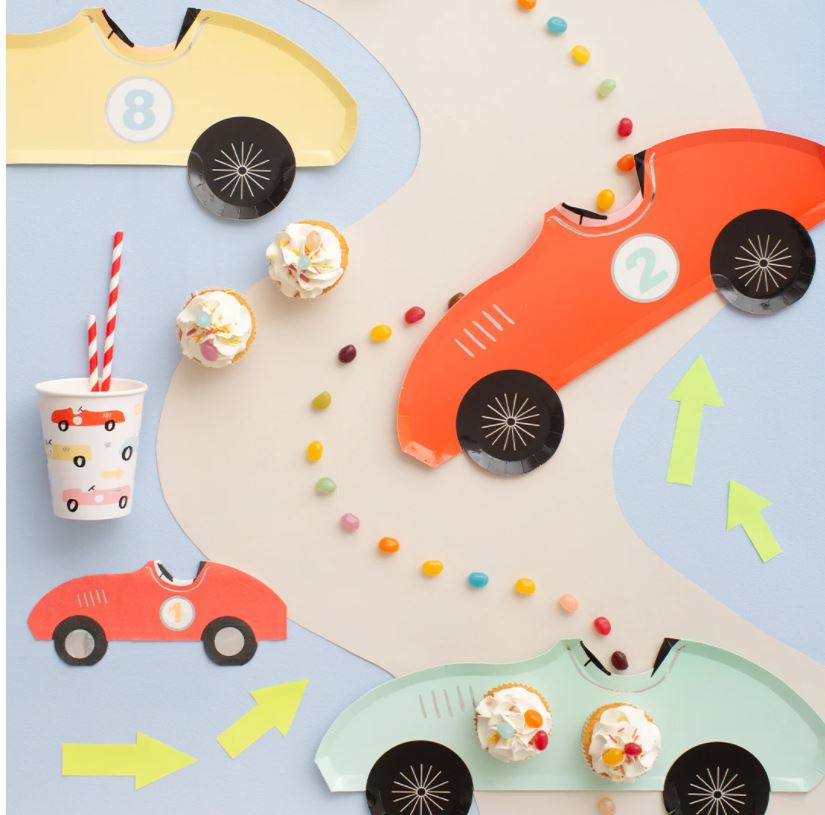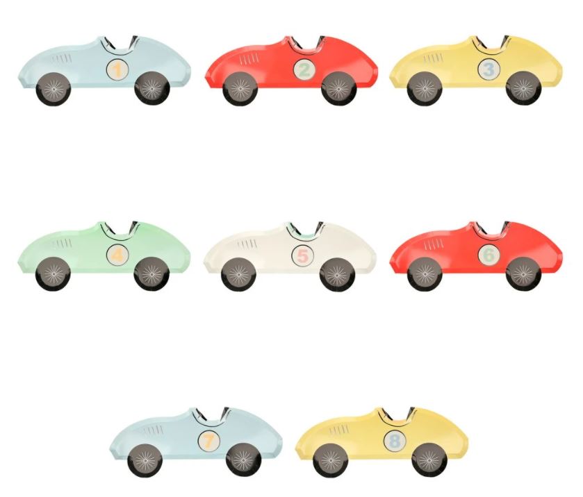 On your marks, get set, go...your guests will love to zoom to the party table to enjoy a meal using these fabulous race car plates. Each pack contains eight plates in five colors - red, white, yellow, blue and mint, with stylish silver foil detail.