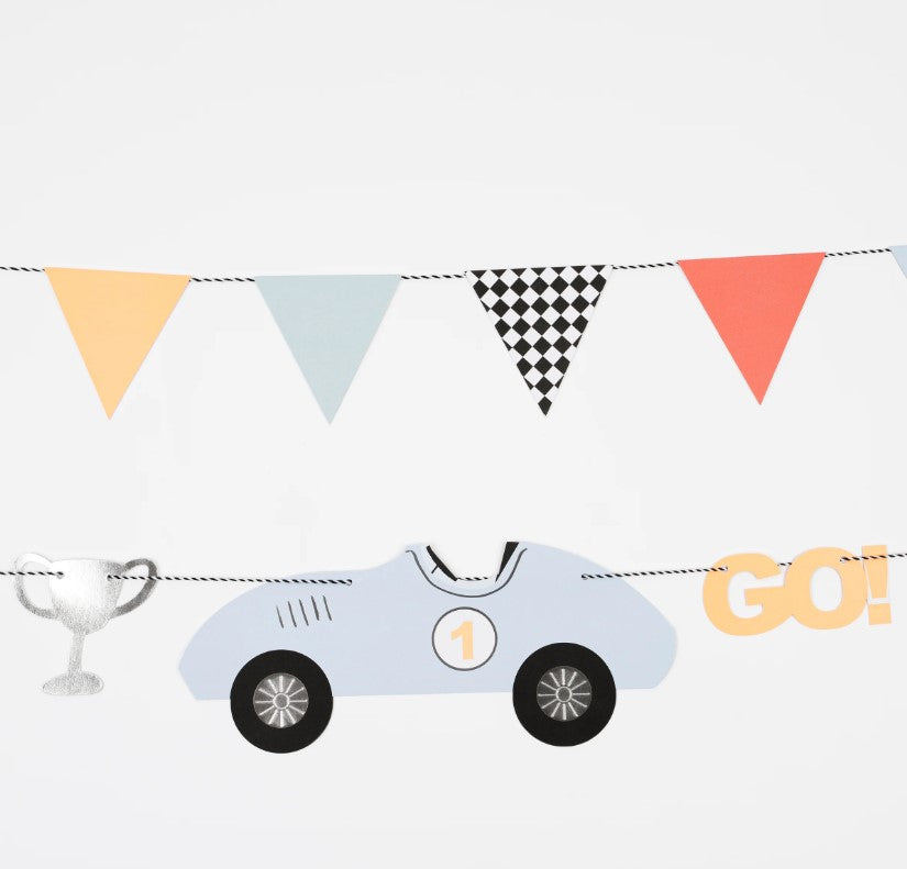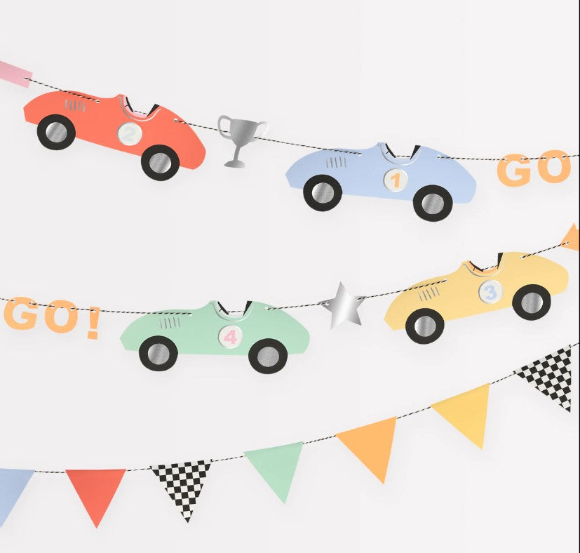 - Two pre-threaded garlands - one with race cars and one with 14 triangle flag pennants