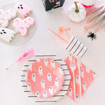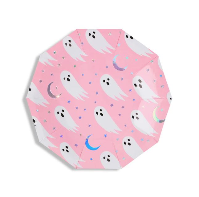 Oh hey, boo! Featuring holographic silver foil and neon coral, these Halloween ghost plates are seriously spooky!