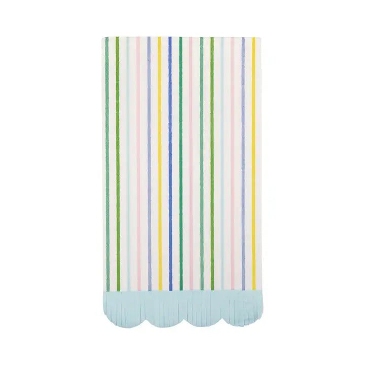 Elevate your spring party with our Spring Stripe Scallop Fringe Guest Napkin! These chic and playful paper napkins feature a striped design and scalloped edges with fringe details. Perfect for adding a touch of whimsy to your event.