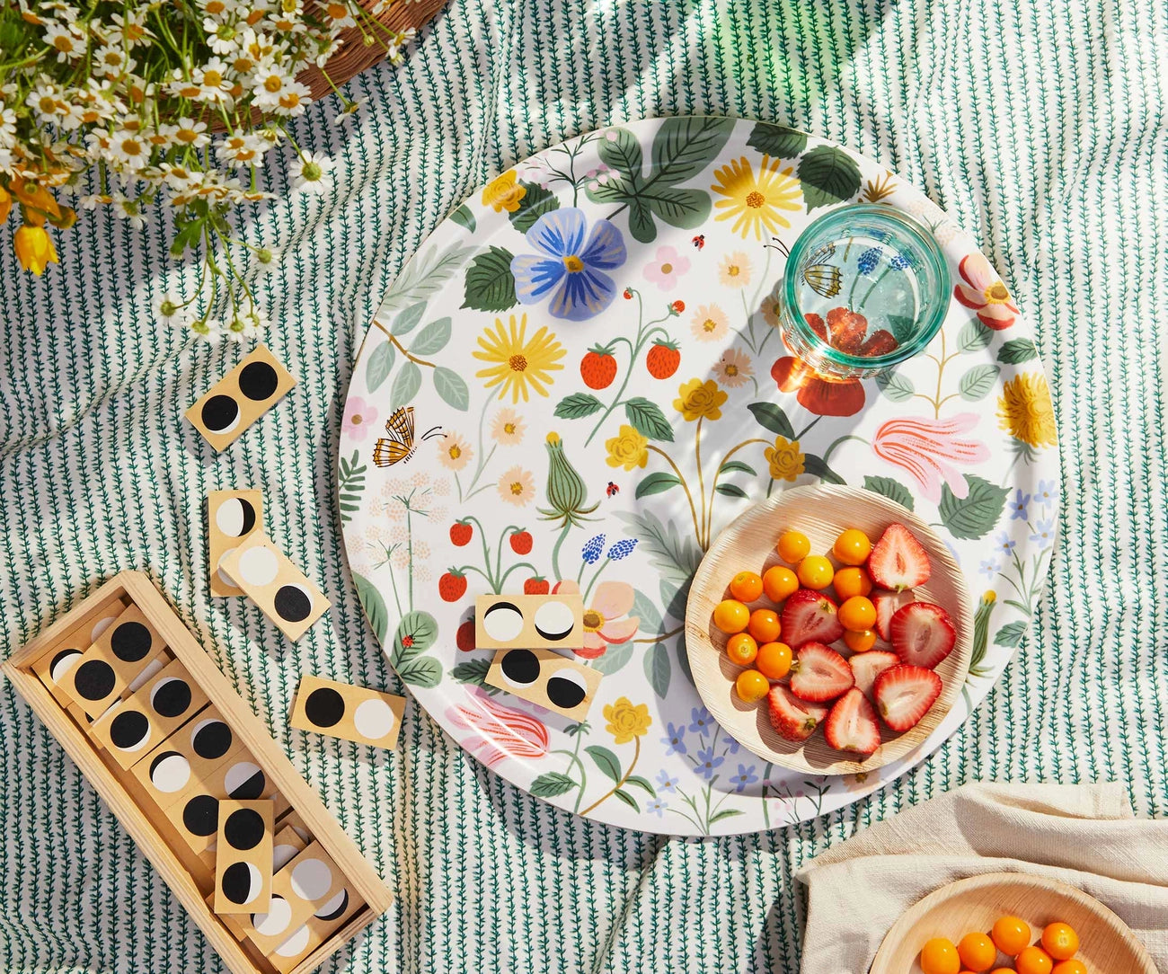 Our bent ply trays are as versatile as they are beautiful, handmade in Sweden from lightweight birch. The laminated finish makes them perfect for entertaining inside and out, or adding a pop of color to your decor. This round tray features the sweet blooms and berries of our Strawberry Fields design, and is perfect for coffee table decor or serving up a tray of drinks.