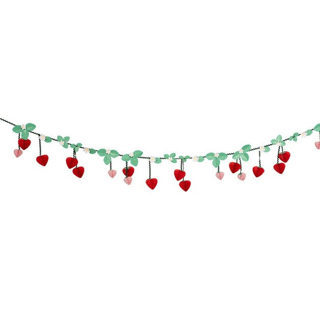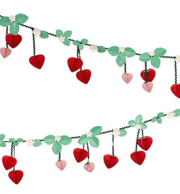 Strawberries are summery and sweet, so it's no wonder this fruity design is having a moment. Bring the beauty of nature to your party with this statement garland. Pink and red 3D honeycomb strawberries team with green paper leaves, 3D yellow and white flowers, and fun ricrac ribbons. It's the ideal decoration for a garden party, picnic or tennis party. Simply place on the party table, wall or mantel, or in the doorway or porch, for a fresh effect. Then pack it away and reuse time after time. Or why not hang it up as a year long vibrant decoration?