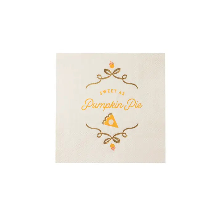 Add a festive touch to fall gatherings with these fun and cheeky Sweet As Pumpkin Pie cocktail napkins. Featuring a pumpkin pie illustration, gold foil accents, and seasonal flair—perfect for Thanksgiving, Friendsgiving, or autumn entertaining. > Includes 20 party napkins > Size: 5" folded (Small/Cocktail Size)