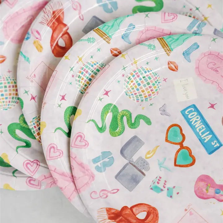 9 inch diameter GLOSS light purple paper plate featuring Taylor Swift icons, such as the Red heart glasses, 1989 Statue of Liberty, the Reputation snake, the Midnight lighter, and more in watercolor!