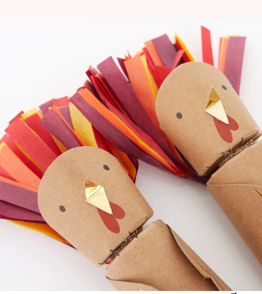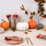 Gobble, gobble...these turkey crackers are a sensational way to add fun to your Thanksgiving table. They are beautifully designed and crafted with a fabulous tissue paper tail, gold foil beak and gold foil details. They each contain a paper hat, joke and an adorable etched wooden animal.
