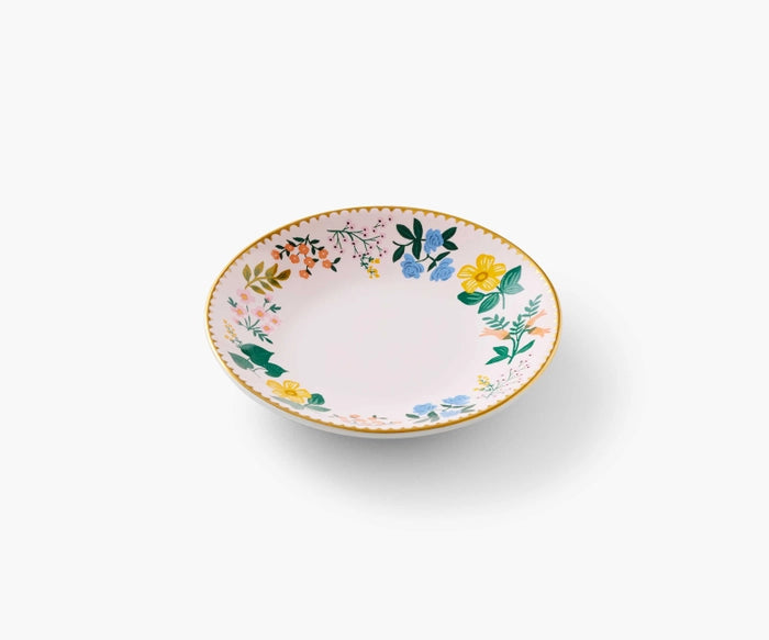 Keep this ring dish by your desk, the sink, or on your nightstand, and keep all your small, special things safe. The porcelain dish features our illustrated Wildwood florals and a metallic gold rim for extra shine.